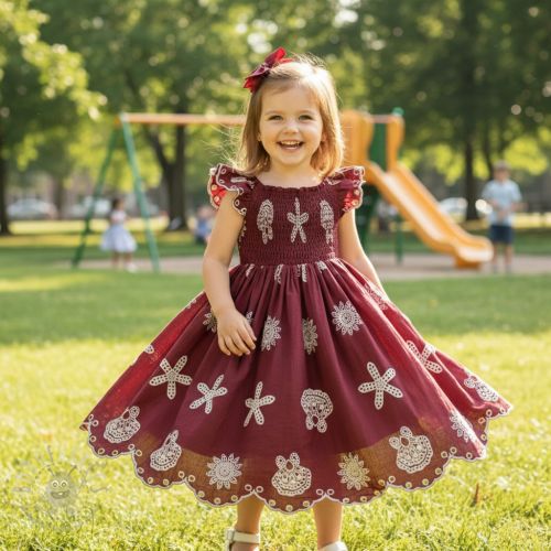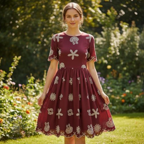 Bombažna tkanina EMBROIDERY Sea ornaments bordeaux