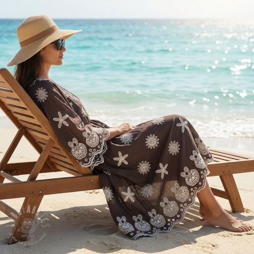 Bombažna tkanina EMBROIDERY Sea ornaments brown