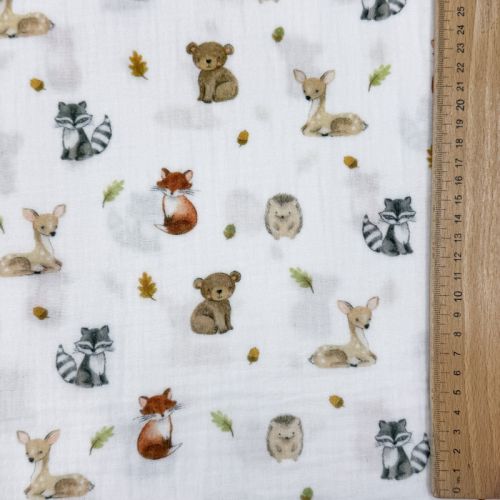 Dvoslojna gaza/muslin Forest animals white digital print